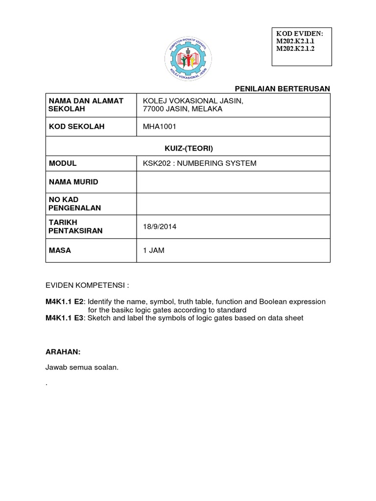 . 72m Sekolah Menengah Teknik Jasin. Kolej Vokasional Jasin. Jalan Kemendor Jasin - 77000 Description.